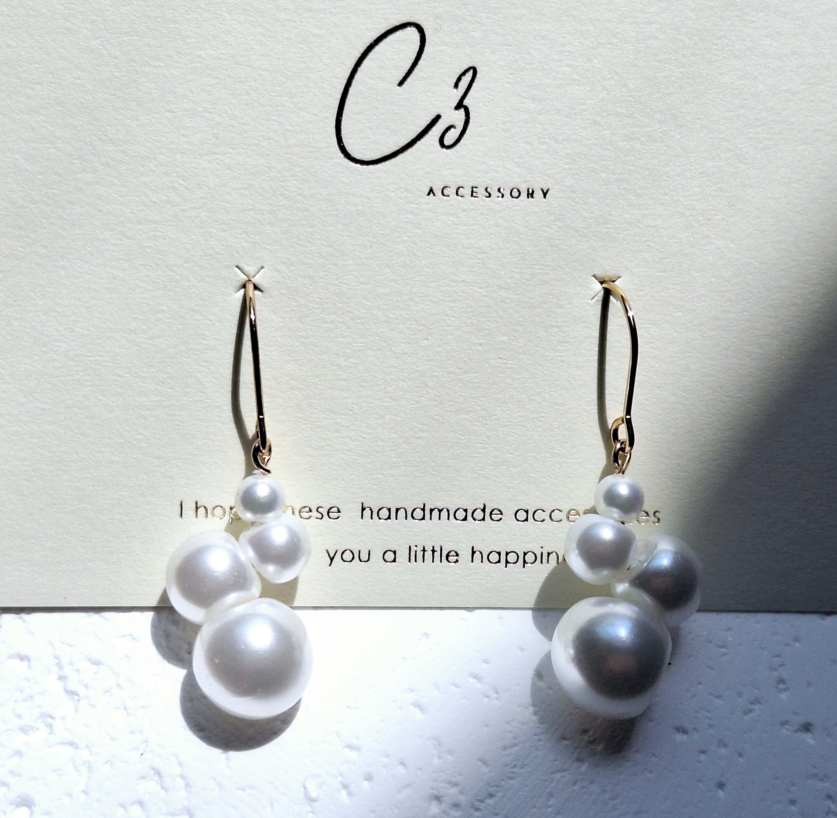 つぶつぶでコロンとした形がとても可愛らしい、大きさの違う鈴丸パールをワイヤーで連ねています。まるで水面に浮かぶ泡のように,寄り添いながらつやつやと輝く美しいピアスです。動きに合わせて耳元で表情を変え、さりげなく上品さと華やかさを演出します。
