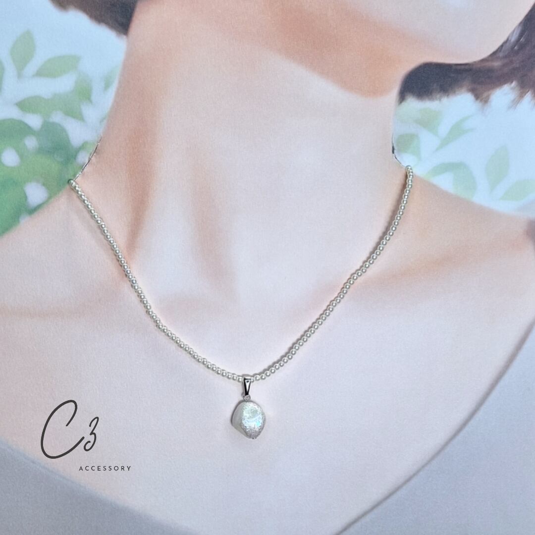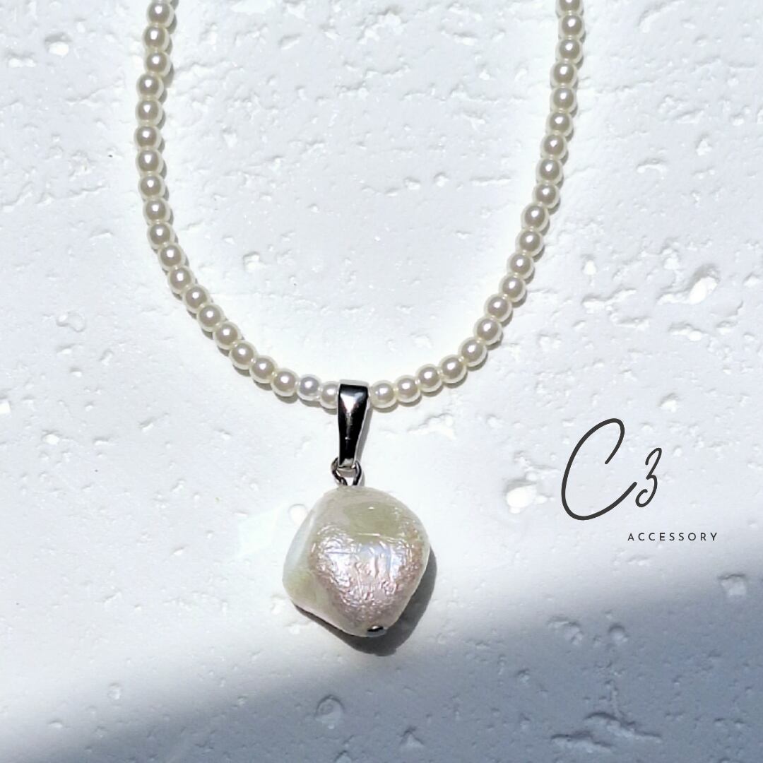 プラスチック樹脂を芯にして、その表面にパール加工を施した人工のパールです。本真珠と比べて軽く、均一な形や色合いを持ち、割れにくく、汗や湿気に比較的強いのが特徴です。不定形なブロック様の形は大きさに存在感があるため、美しい陰影をつくり胸元に女性らしい印象を与えてくれます。